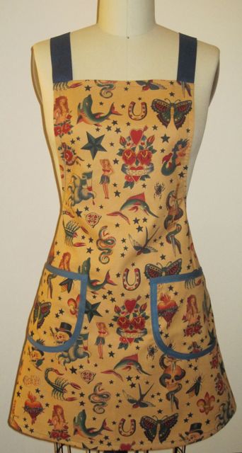 Vicky explained that she is a seamstress for a new company called Cupcake Provocateur. Check out their site, it's pretty cool. Vicky's boss, Cynthia, is the brainchild behind the business, designing all of the aprons and other housewares, as well as making the cupcakes. There are several tattoo-inspired apron designs on their site, including this one, which would make a great holiday gift, no?